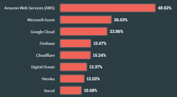 When it comes to cloud platforms, for all respondents, AWS is still the most popular cloud computing platform, while Hetzner, a German company, earned high admiration. Together with Vercel, Cloudflare, and Fly.io, it was more admired than AWS and other platforms. Heroku experienced a significant decline in popularity.