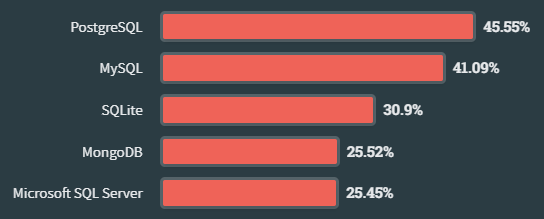 Regarding the databases, MySQL lost out to PostgreSQL for the top rank. Professional developers are more likely to use PostgreSQL (50%) than those learning to code, whereas those learning are more likely to use MySQL (54%).