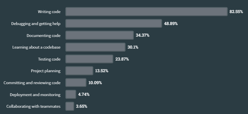 Most people presently using AI tools claim benefits from writing code, but those not interested in utilizing AI tools find this to be the least advantageous.