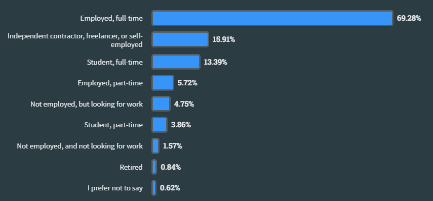 The number of "Independent contractor, freelancer, or self-employed" respondents increased slightly for all respondents this year compared to last year, while the percentage of full-time students decreased somewhat (1%). Other job statuses changed less significantly.