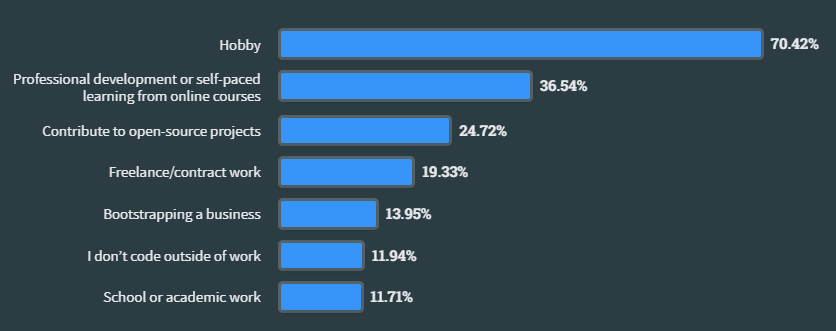 Most Professional Developers (70% of them) code as a hobby outside of work, while 37% do it for self-paced online learning or professional development.