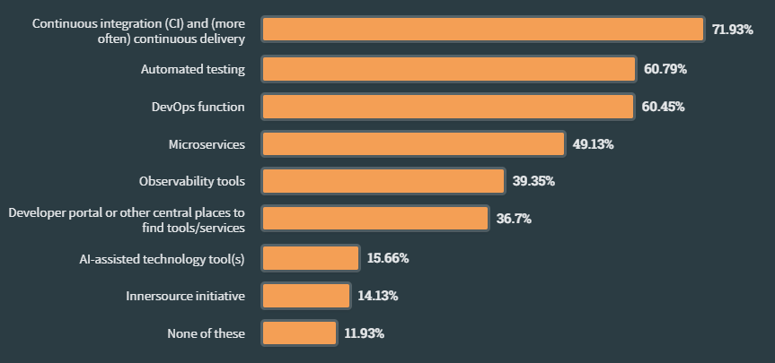 Most Professional Developers claim that their company offers CI/CD, automated testing, and DevOps. Developers report using observability tools rather than a developer portal to find tools and services more easily (39% vs. 37%).