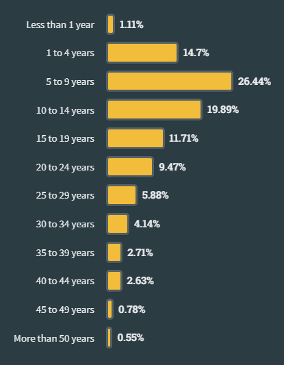 Regarding years of coding, 48% of respondents have been coding for less than ten years.