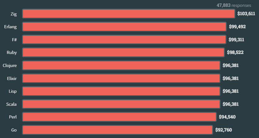 Among the niche languages, ZIG, Erlang, and F# stood out as the highest-paid. Zig took first place with an annual salary of $103,611, Erlang with $99,492, and F# worth $99,311. Ruby surprisingly claimed the title of the highest-paid language, with $98.522. Most languages experienced salary increases of 10% or more from the previous year.