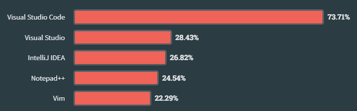 All developers favor Visual Studio Code as their favorite IDE, with learner developers using it more frequently than professional developers (78% vs. 74%, respectively), while Neovim is the most desired.