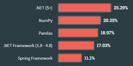 When it comes to the other frameworks, .NET (5+) is the most popular and admired, followed by NumPy and Pandas. .NET Framework (1.0-4.8) is in fourth place, but if we added the .NET (5), overall, it would be the most popular other framework by far. Tauri is the most desired one.