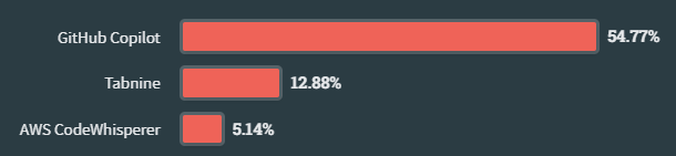 Regarding the AI development tools. With 55% of respondents using it the previous year, GitHub Copilot is the most popular AI developer tool overall, more than four times as popular as Tabnine, which came in second place with 13%.
