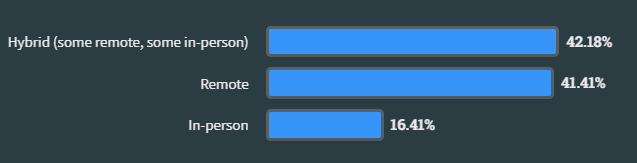 For larger firms, hybrid is here to stay; more than half of employees in organizations with 5,000+ employees are hybrid. One out of every five firms with fewer than 20 employees reports conducting business in person. Developers are working on-site this year (+2%) more than last year. Leaving aside initiatives to return to the office, coding lends itself well to entirely remote work, and at least one-third of all organization sizes still utilize this model.
