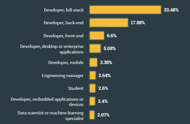 Most responses are still full-stack, back-end, front-end, and desktop/enterprise app developers. For the first time this year, they surveyed developers and found that almost.3% of them identify as developer advocates.