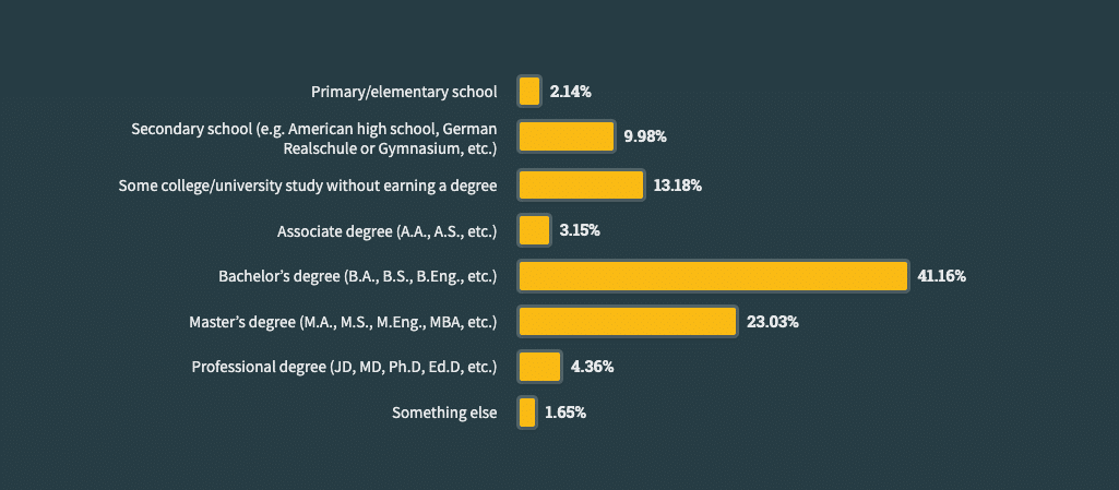 A degree remains a common path to becoming a professional developer, with 75% of respondents obtaining one. However, many developers need a degree to enter the field. Most experienced developers hold a Bachelor’s degree (47%) or a Master’s (26%). As for those currently learning to code, a significant portion falls within the 18-24 age group.