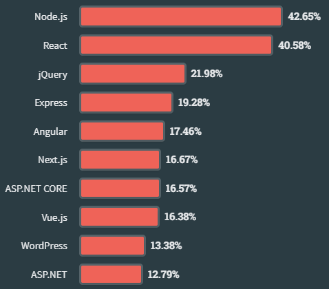 Node.js and React.js are the two most common web technologies all respondents use. Next.js moved from 11th place in 2022 to 6th this year, likely driven by its popularity with those learning to code.