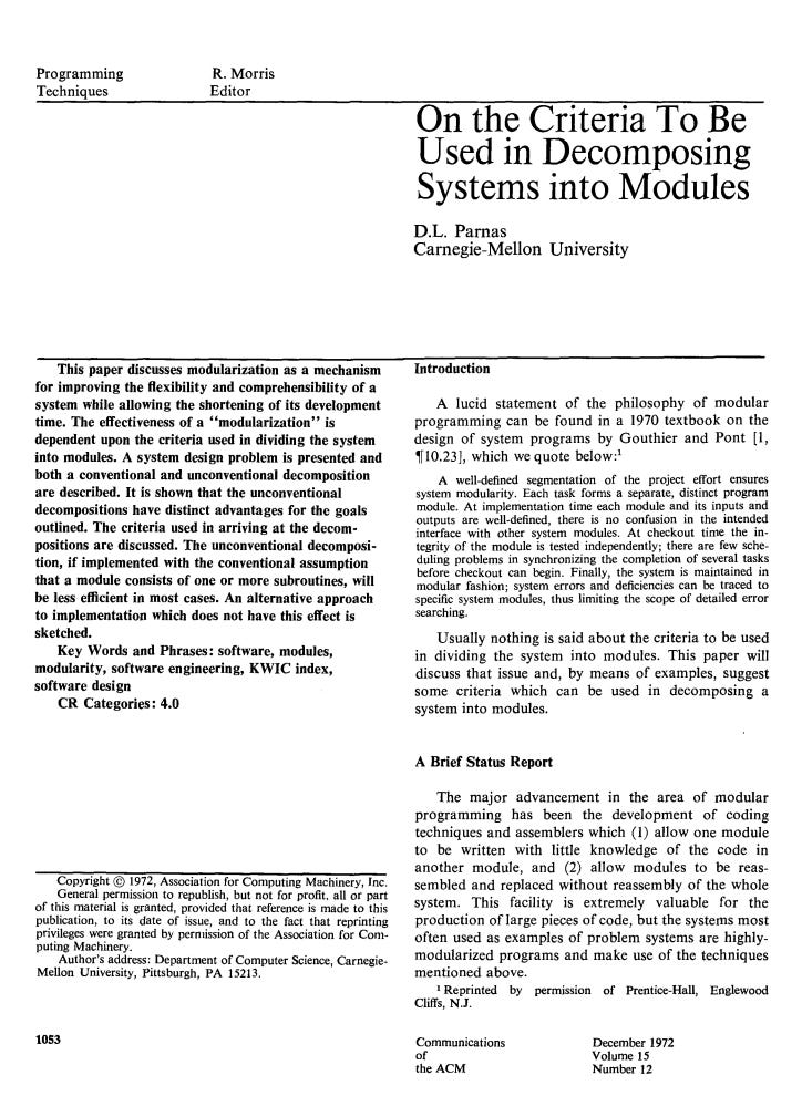 1. 📄 On the Criteria To Be Used in Decomposing Systems into Modules (1972), D.L. Parnas