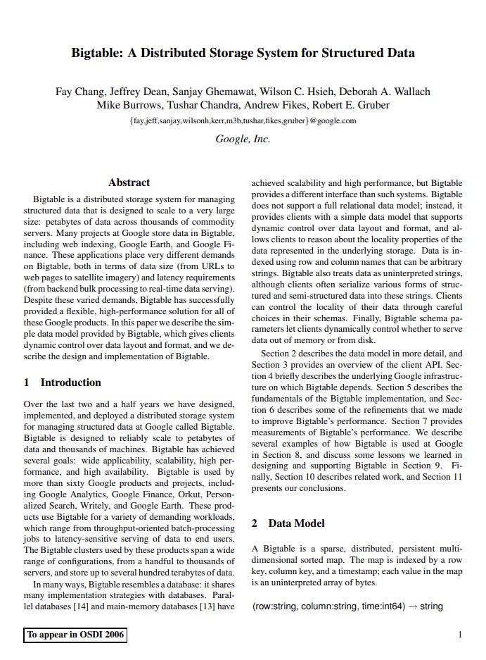 The paper presents Bigtable, a distributed storage system for managing massive structured data at Google (read NoSQL DB). The key goal was to create a scalable, highly available, and highly performant data store. Google uses Bigtable to store data from many services, including web indexing, crawling, Google Earth, etc.