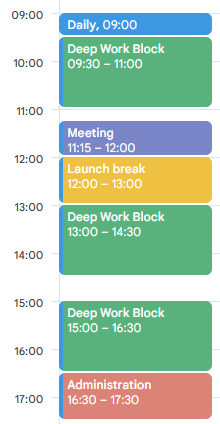 🔒 Deep work blocks: Block out 90-minute periods for focused work (check out Cal Newport's book Deep Work). Research shows that this is the optimal time for maintaining sustained concentration. We need to have at least 4-6 hours of focused work. Block these on your calendar and treat them as seriously during the day when you have the most energy (usually morning for most people).