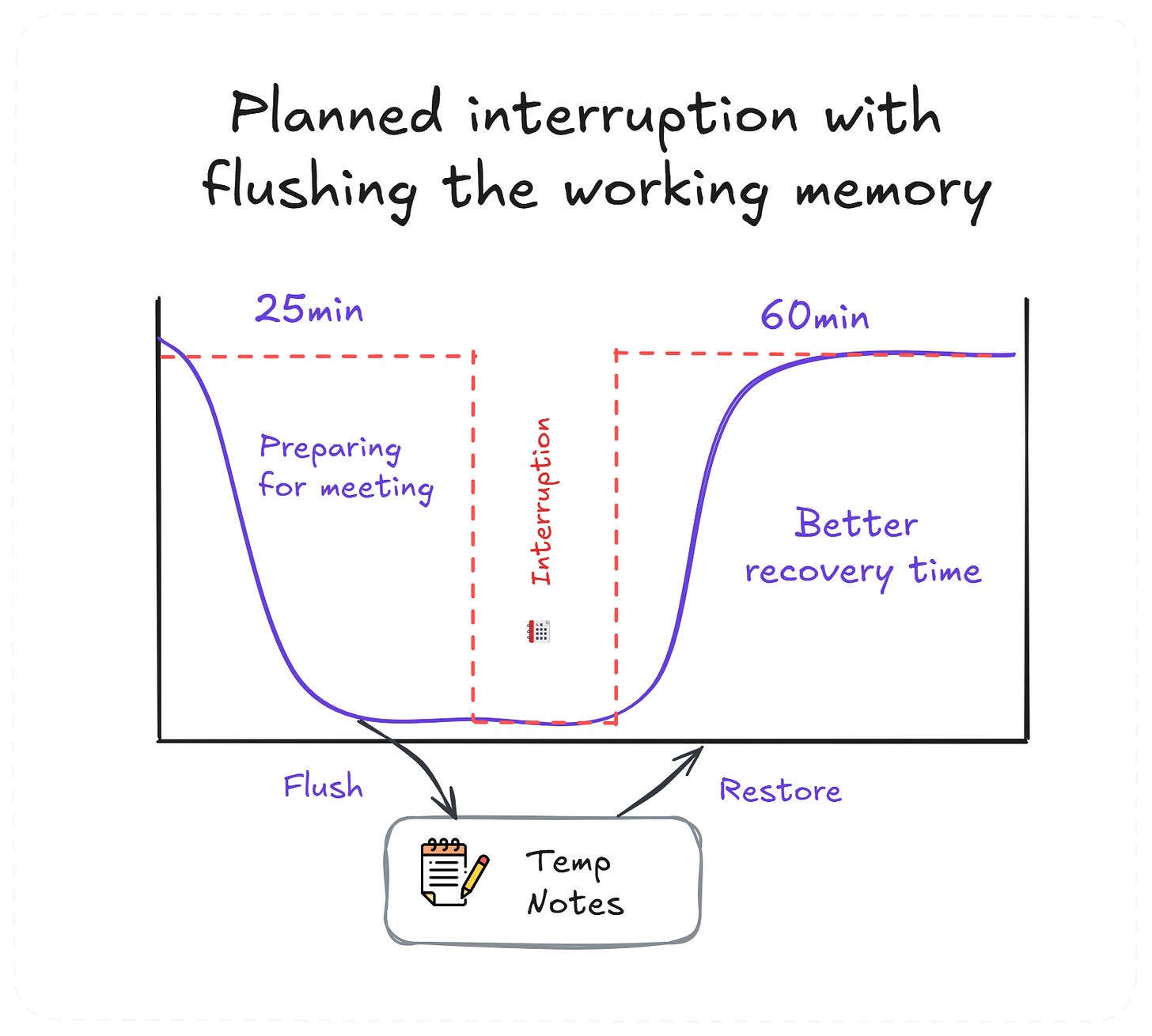 🅿️ The parking lot technique: Keep a simple text file open while you work. When random thoughts or tasks arise, quickly jot them down instead of acting on them immediately. This will prevent your mind from becoming an interruption source.