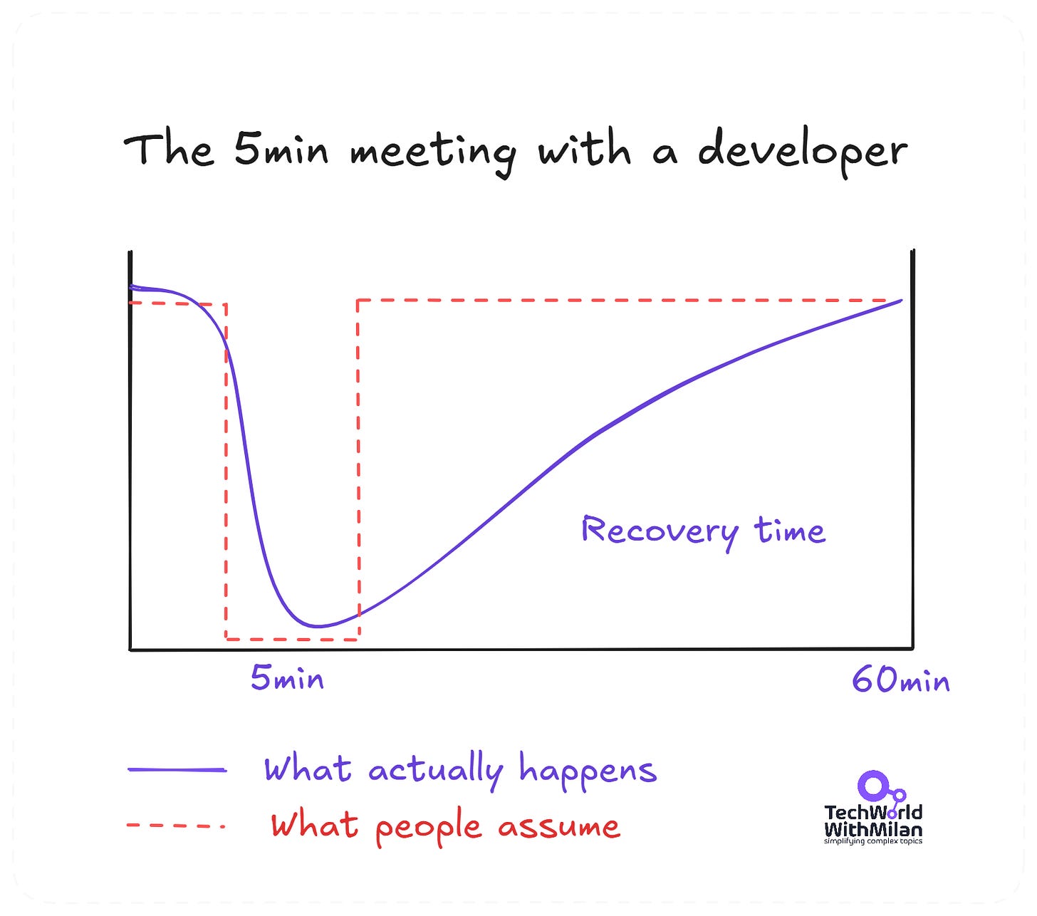 Morning interruptions were particularly costly. One developer described spending two hours architecting a new feature in his head, only to have his mental model wholly disrupted by a "quick sync" meeting. He estimated it took him three hours to get back to the same level of understanding before the interruption. Why? People usually have the most energy and concentration to do complex stuff in the morning.