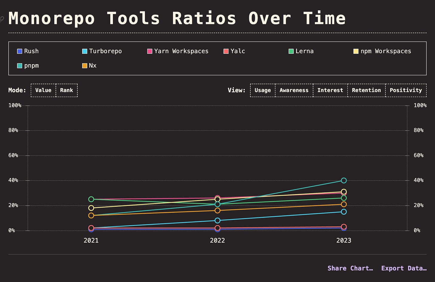 ✅ With no tool being used by more than 40% of respondents, the mono repo tools are a varied collection of solutions that appear to be evenly utilized. Except for ppm, where retention has remained steady, interest in and use of the various tools are generally falling.