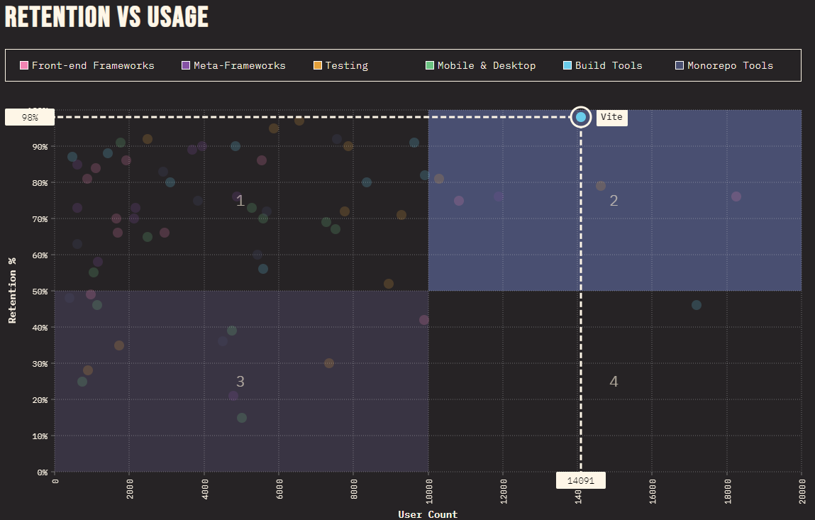 ✅ Vite, a local development server for modern web apps, took multiple prizes as the most adopted technology (+25% increase), with the highest retention (98% will use it again), and the most loved library (88% have a favorable opinion about it).