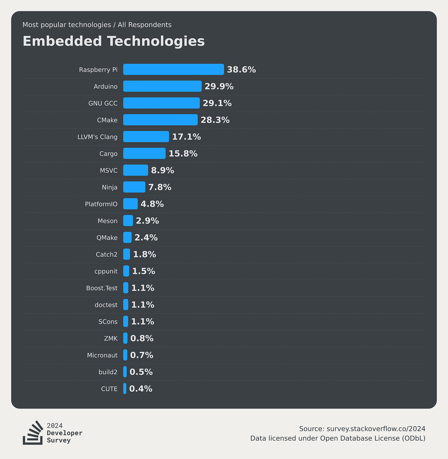In the embedded technology space (where 3% of developers are working), Raspberry Pi (39%) and Arduino (30%) top the list.