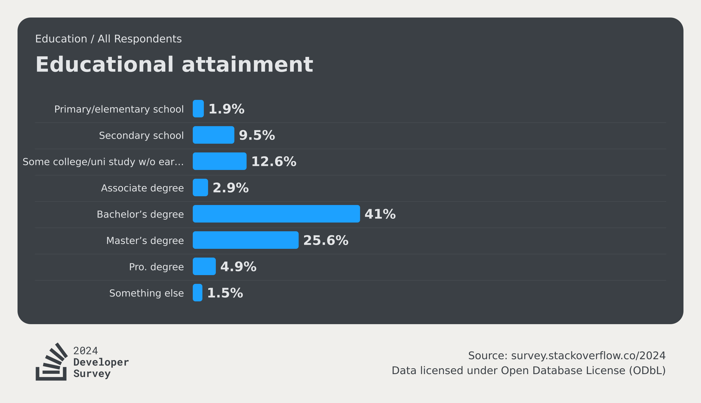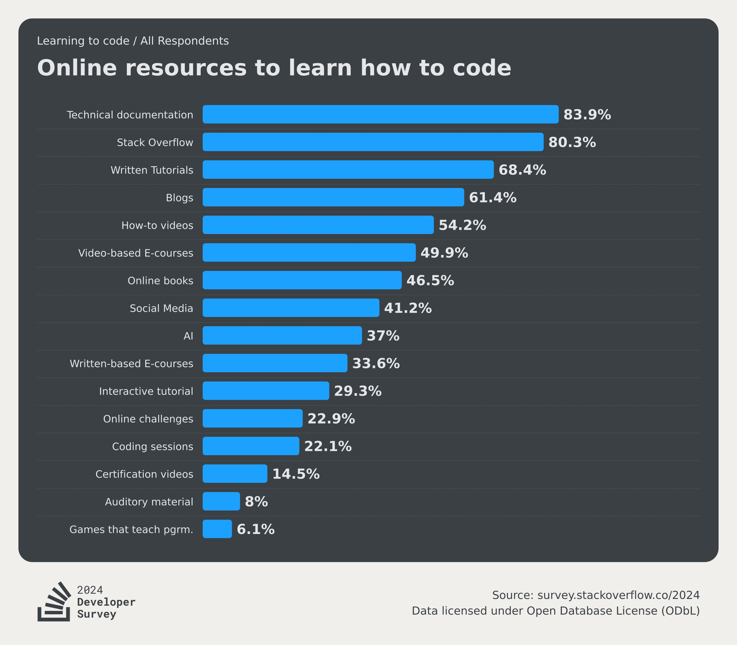 Learning trends among developers. Most developers (82%) are learning to code through online resources, with technical documentation and tutorials being the most favored methods. This trend highlights a shift from traditional educational pathways, as only 49% are learning in formal educational settings.