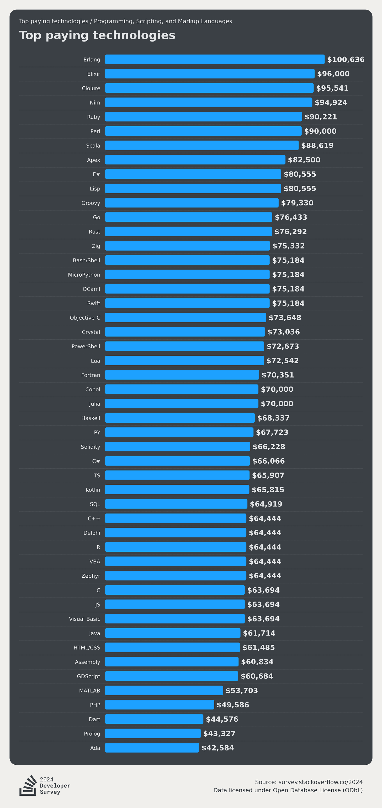 When discussing top-paying technologies, Erlang is at the top, followed by Elixir. Why are they on the top, especially Elixir? Because Elixir is built on the Erlang virtual machine, it has several advantages. To manage concurrent, distributed, and fault-tolerant systems, Ericsson created Erlang in the 1980s for use in telecommunications systems. Simplifying intricate systems is one of Elixir's best qualities. Additionally, its automatic restarts and built-in fault tolerance help developers frequently work around problems with it without the end user noticing. Today, with Python, Elixir is mainly used to run models like Stable Diffusion natively on the GPU.