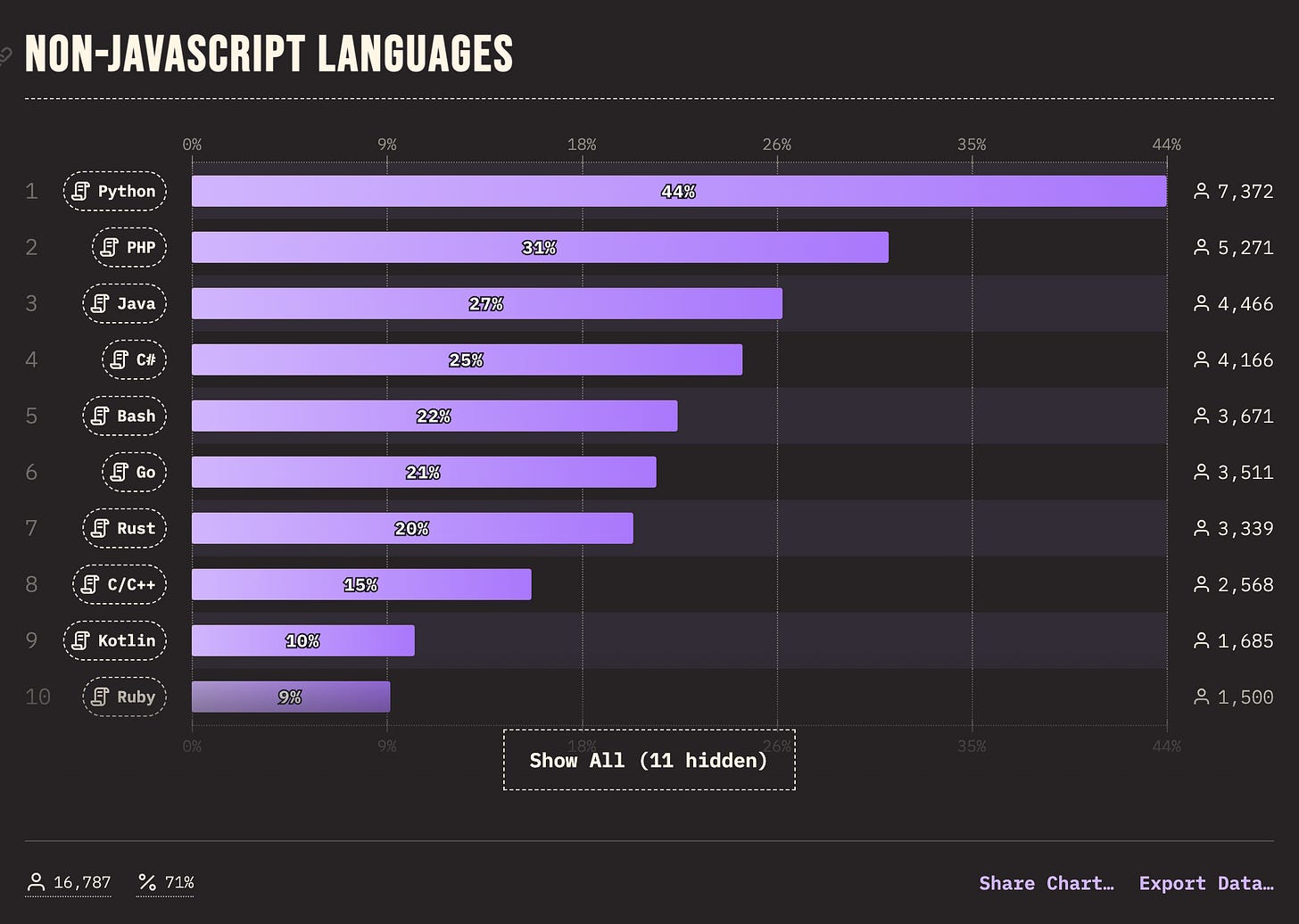 ✅ Python is mainly used together with JavaScript (44%), assumed on the backend side, followed by PHP (31%) and Java (27%).