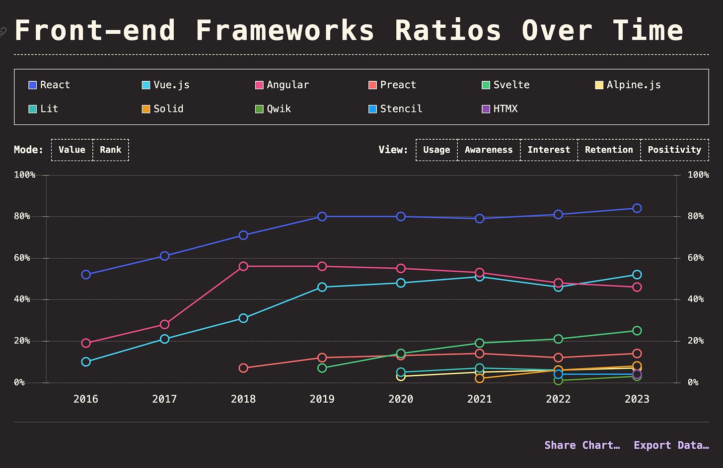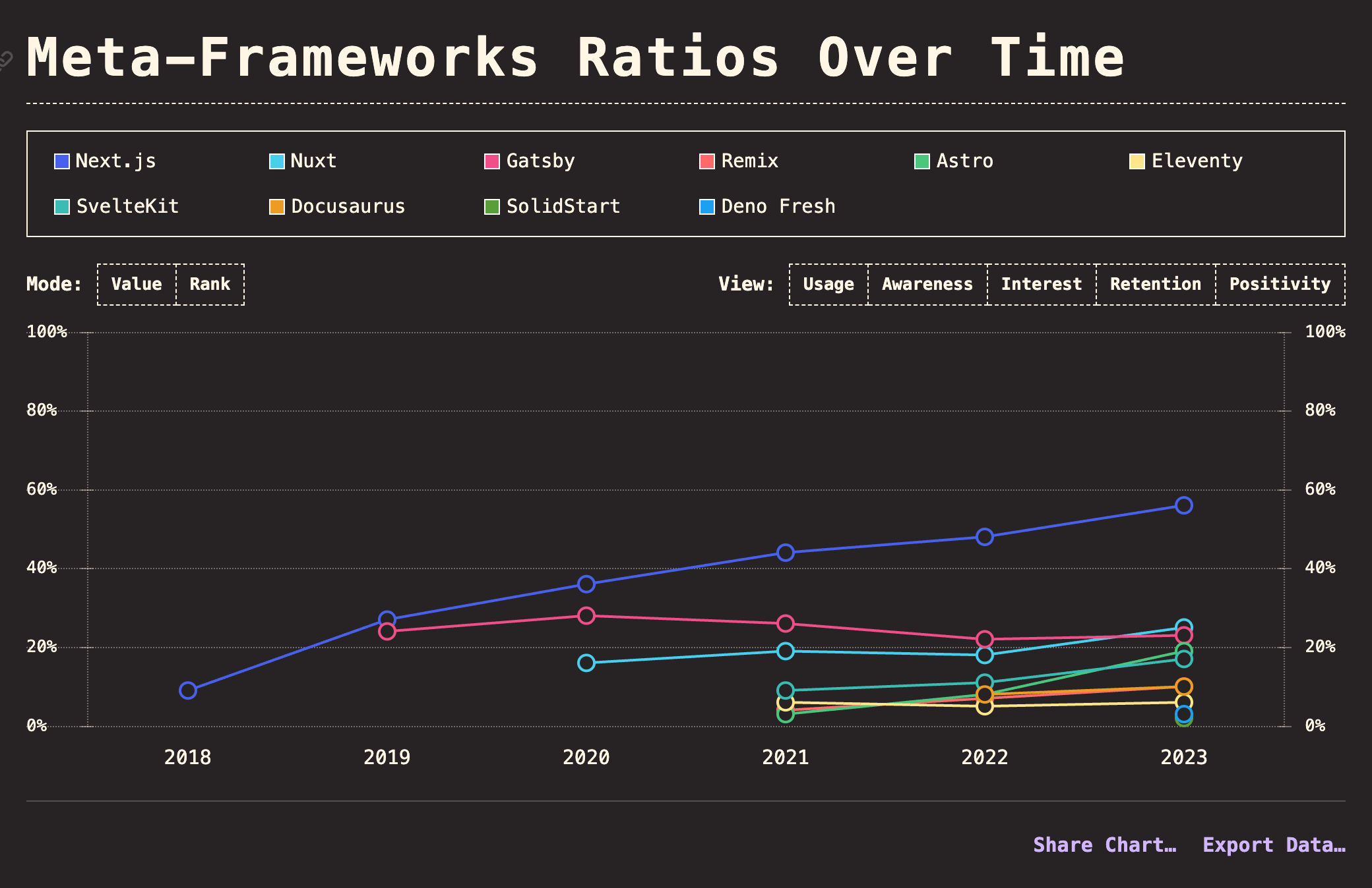 ✅ The winner among meta frameworks is Next.js, which offers server-side rendering and static website development for React-based web apps. Although they are becoming more popular, newcomers like Remix, Astro, and SvelteKit still only account for somewhat less than 20% of respondents when it comes to usage.