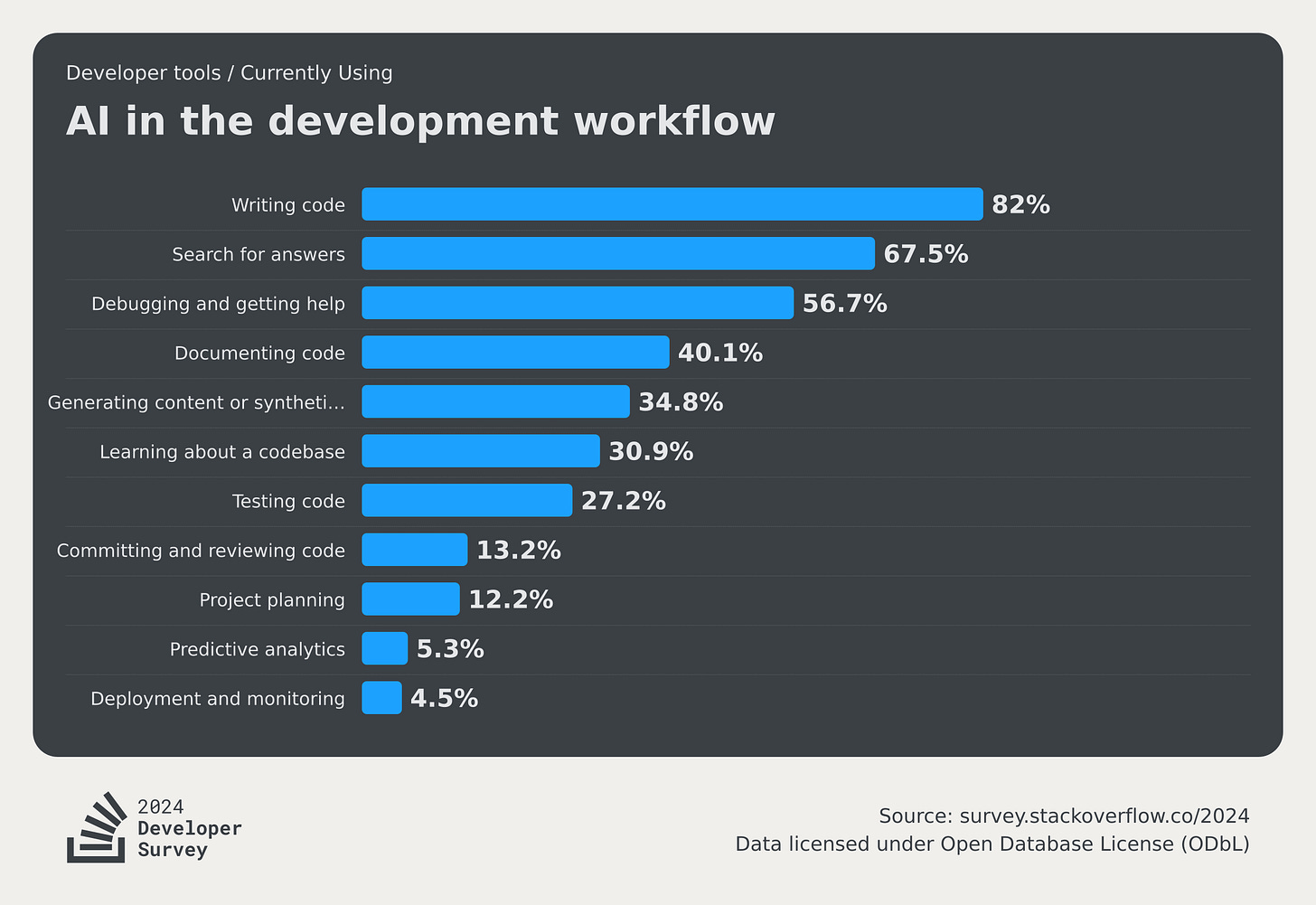 Impact of AI Tools on Development. 76% of developers are using or planning to use AI tools, with 81% acknowledging that these tools enhance productivity. Despite this, nearly half of the respondents believe AI could outperform them in solving complex tasks. Developers primarily utilize AI for code writing (82%), while many are still cautious about its role in testing.