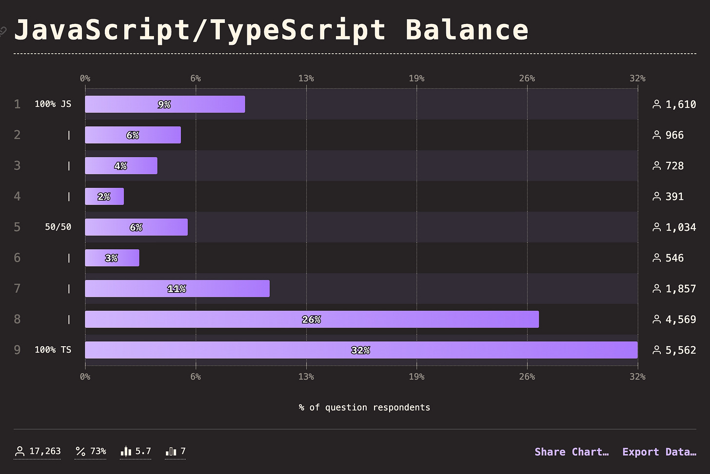 ✅ TypeScript is rising, as 32% of respondents say they use 100% TypeScript, while the second-place group uses 75% TypeScript and 25% JavaScript.
