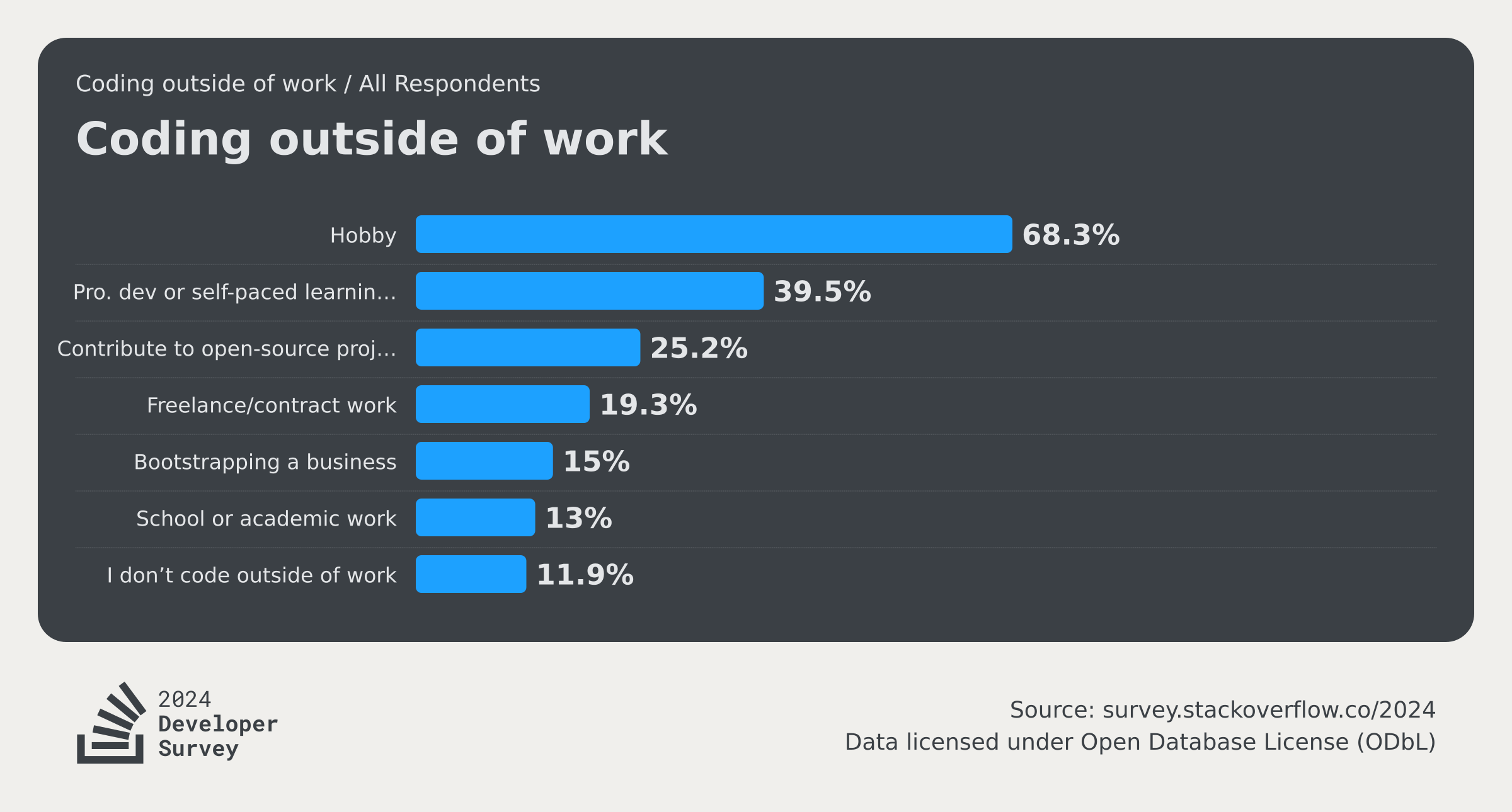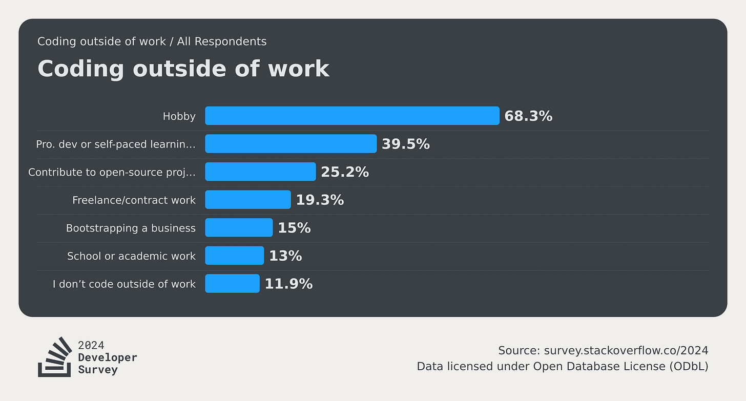 Also, what is interesting is that more than 68% of developers like to code outside of work as a hobby.