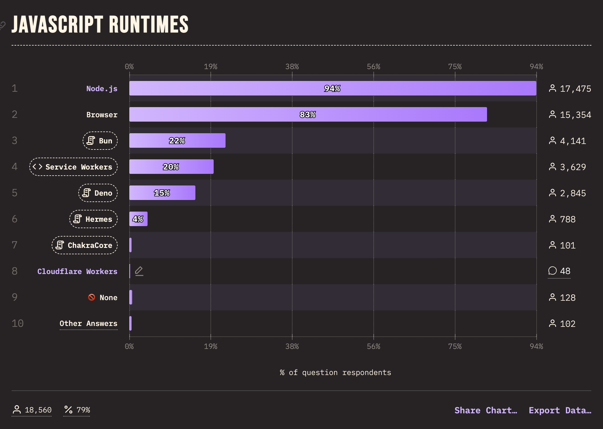 ✅ Out of all the JavaScript runtimes, 94% of respondents choose Node.js. With 353 mentions, Bun, at 22%, received the most write-ins.