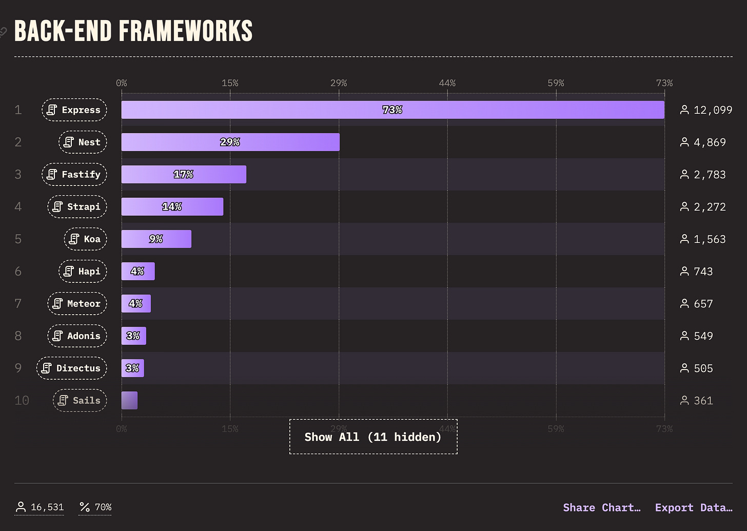 ✅ Express is the most often used option for those utilizing JavaScript on the backend (73% of responses), indicative of its enduring appeal and robust ecosystem. Nest is now at 29%.