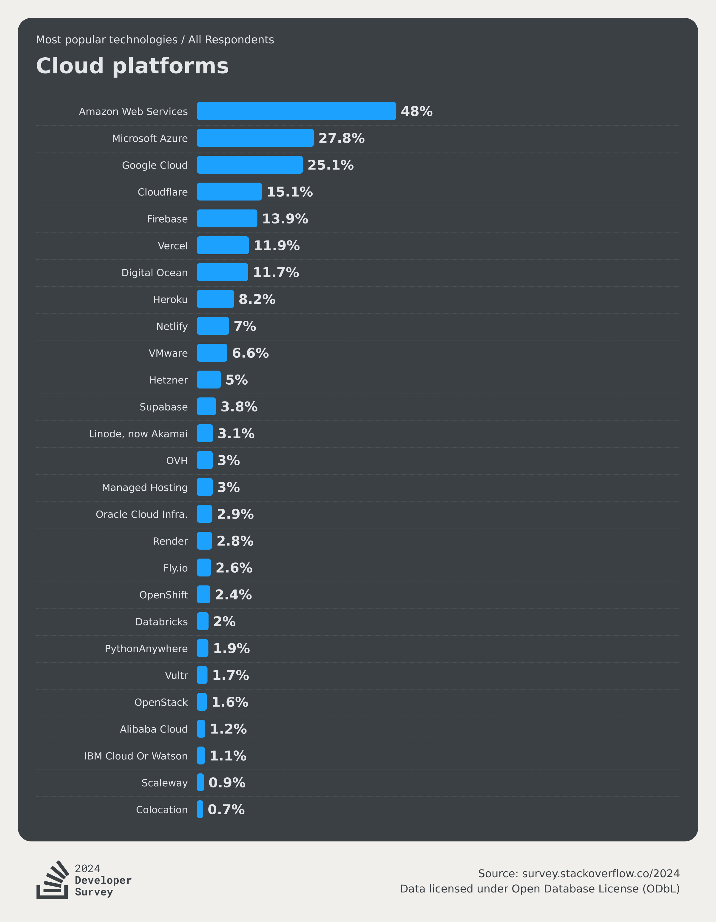 AWS, Azure, and Google Cloud are still the most popular Cloud platforms. Azure and Google Cloud have increased their share. Azure usage has climbed from 26% to 28%, and Google Cloud usage went from 24% to 25%.