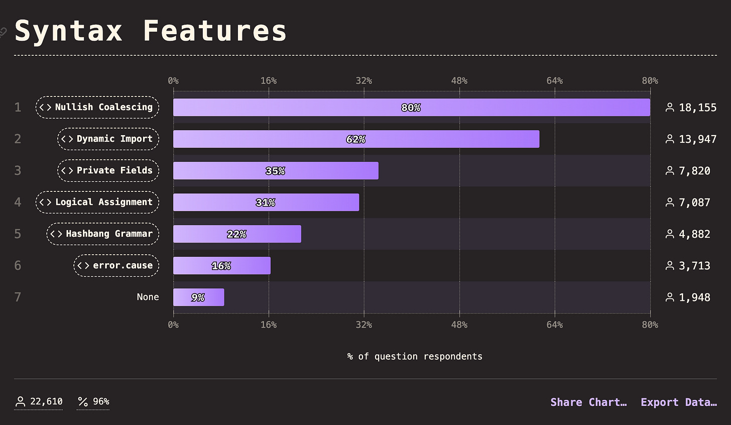 ✅ The most adopted JavaScript syntax feature is Nullish Coalescing, followed by Dynamic Import.