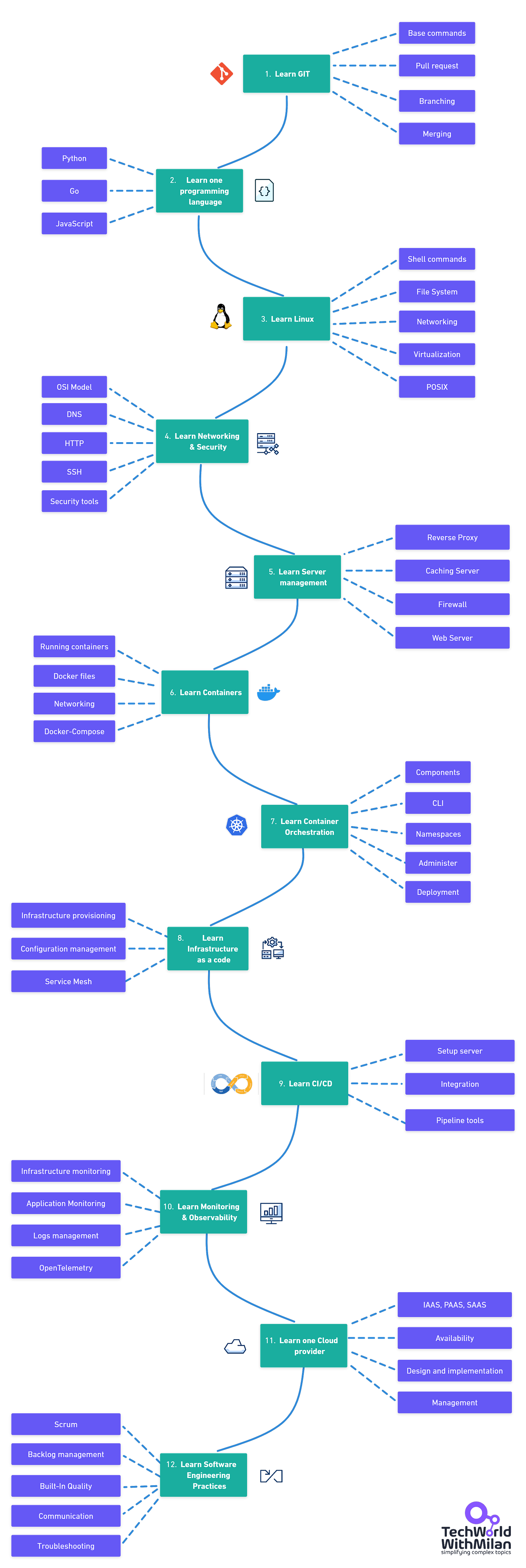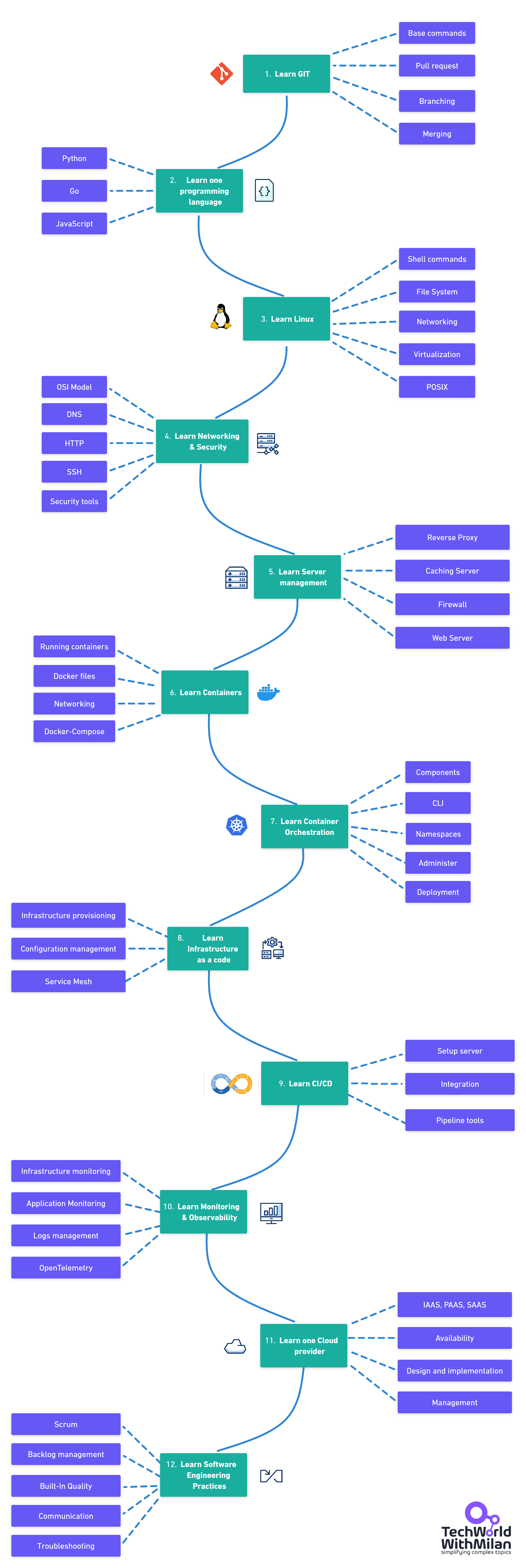 This is a step-by-step guide on how to become a DevOps engineer in 2023, with links to relevant learning resources. In the path below, we can see a DevOps Roadmap for someone who would like to learn more about DevOps: