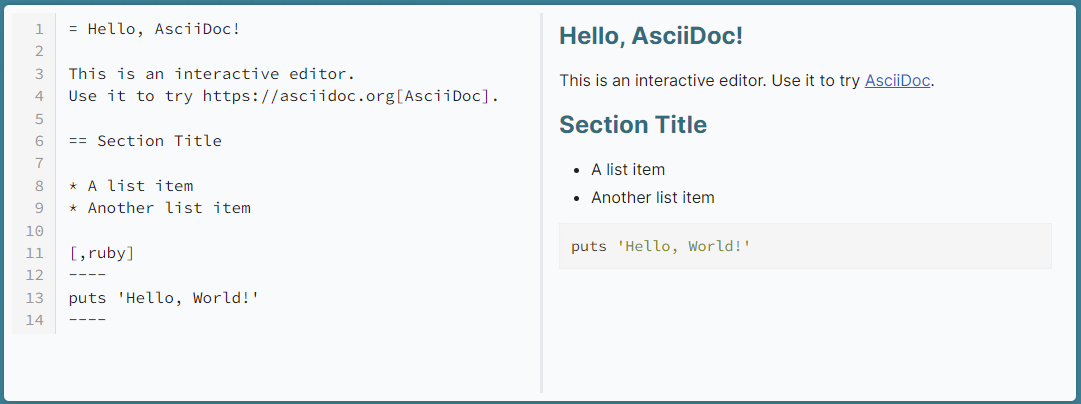 An example of the AsciiDoc file (on the left), with the preview (on the right):