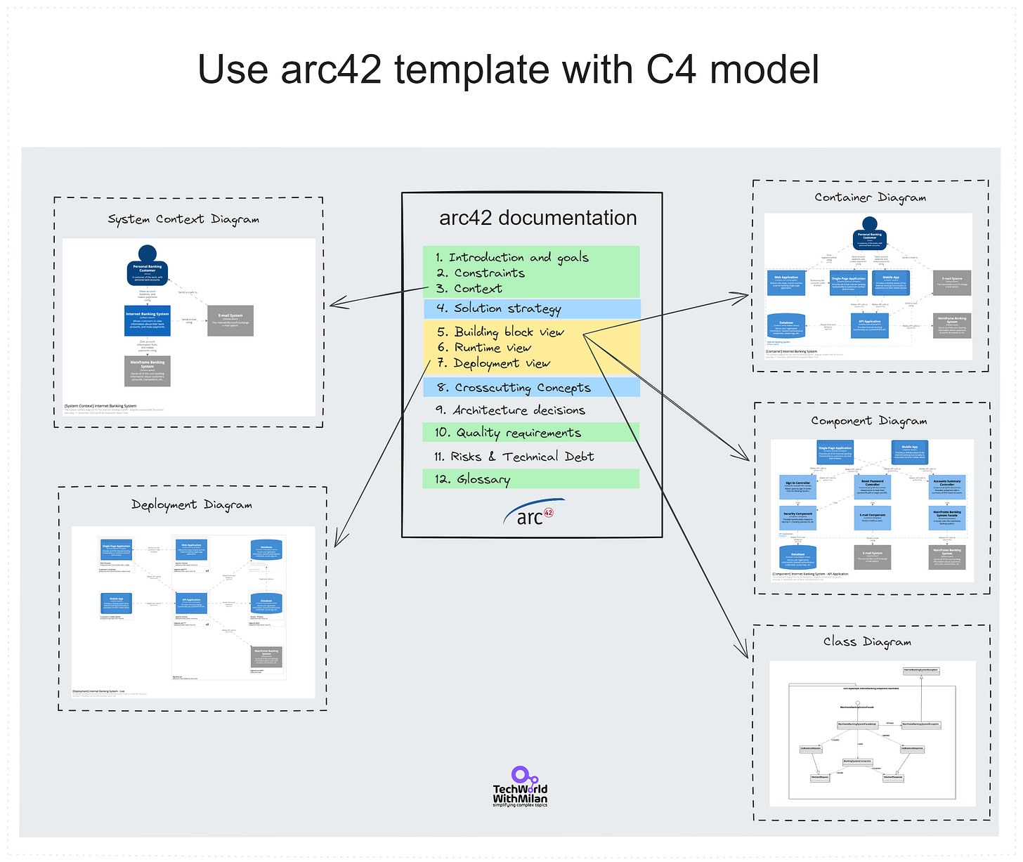 Now that we know how to use the arc42 template and what the C4 model is, we can use them together by mapping certain sections of the arc42 template to some C4 diagrams.