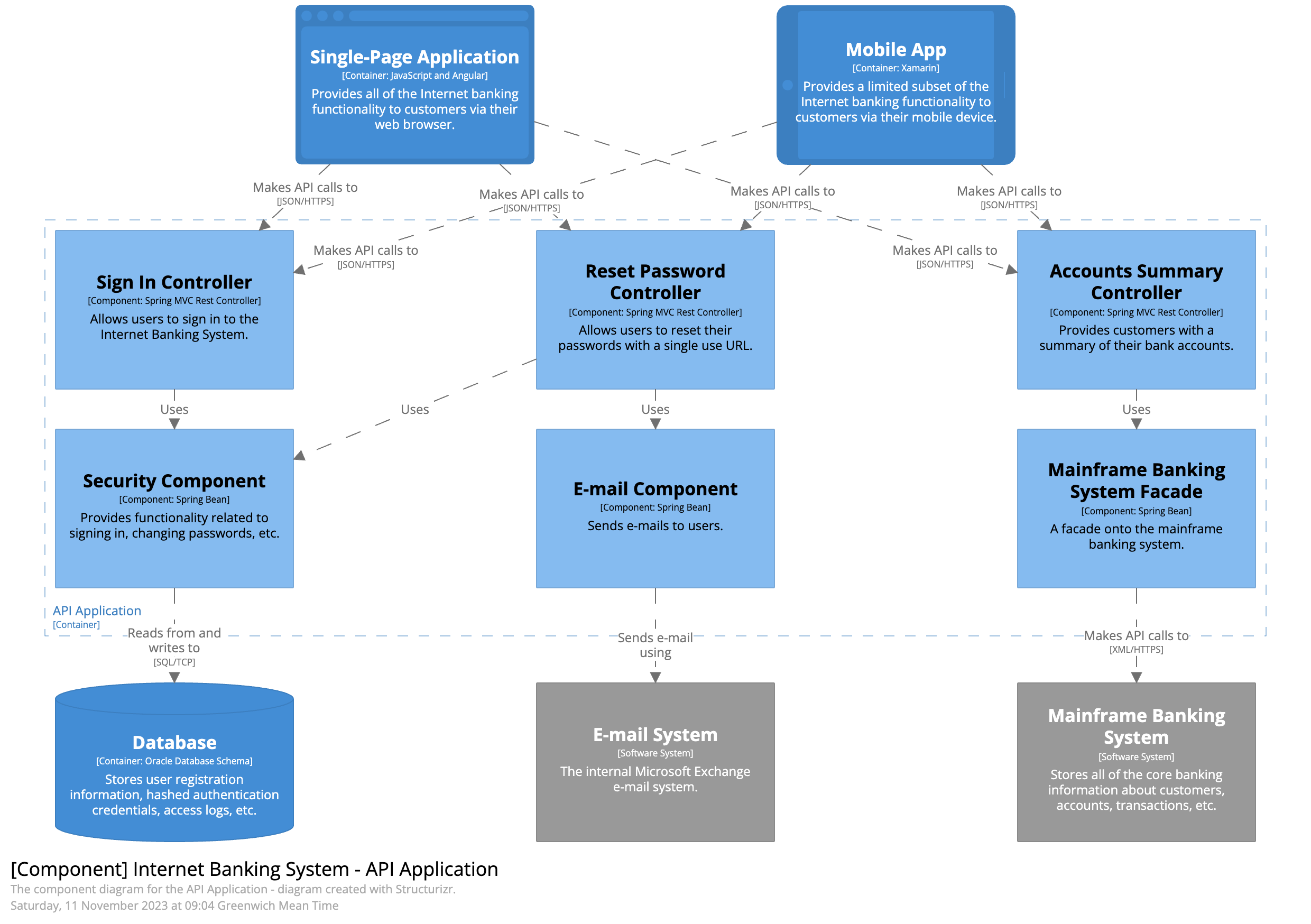 This diagram shows the internal components of a container and how they interact with each other. It allows us to visualize abstractions in our codebase. For example, in C#, it is an implementation class behind some interface.