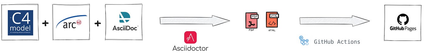 Now, when we have a documentation framework (arc42) and the diagramming model and tools (C4 and Structurizr), we can use tools such as AsciiDoc to maintain such documentation in version-controlled systems like Git close to the code. The arc42 template is already available in the AsciiDoc format. AsciiDoc is a text-based markup language that allows you to write documents in a plain text format that can be converted into formats like HTML, PDF, EPUB, and more.