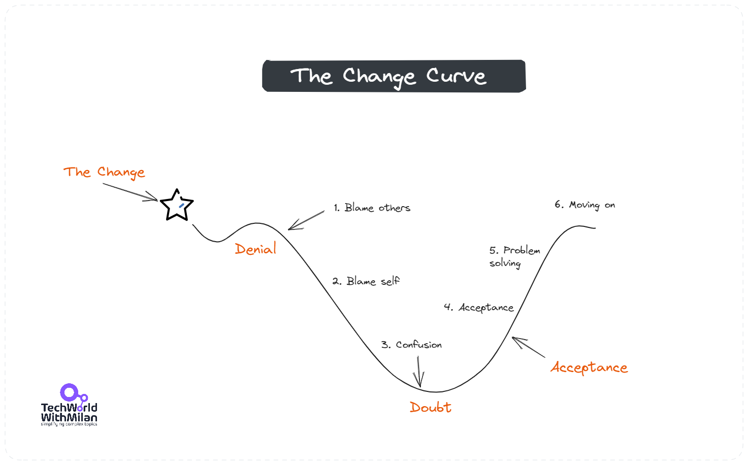Denial. At this initial stage, people might be in shock or denial about the change. They might believe the change is optional or hope it will disappear.