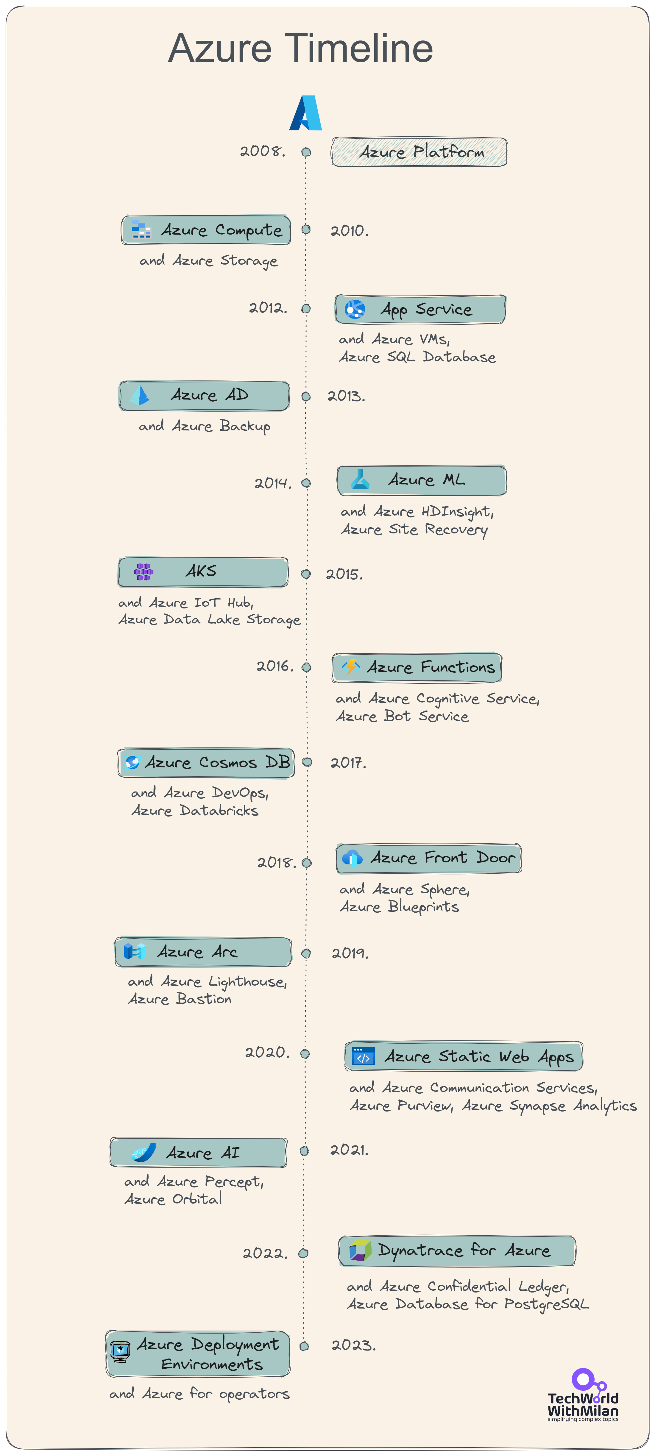 The present and beyond (2023) - Microsoft adopted Kubernetes and launched Azure Arc, allowing customers to manage various workloads from a single control plane. Azure offers over 600 services, combining SaaS, PaaS, and IaaS, making it a leading platform in the cloud service industry.