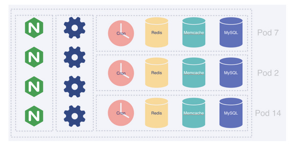 Only the databases are podded since they are the hardest component to scale. Everything else that is stateless is scaled automatically according to the incoming traffic levels and other load parameters using a custom Kubernetes autoscale.