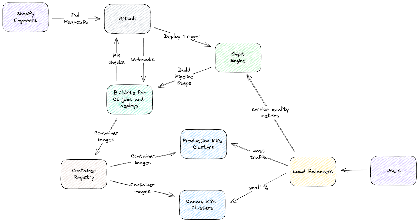 All Shopify deployments are based on Kubernetes (running on GCP), so each application is a container (or a fleet of containers) somewhere in one of our clusters. Our deployment pipeline is built on the Shipit engine (created by Shopify and open-sourced years ago). Deployment pipelines can get pretty complex, but it mostly boils down to building an image, deploying it to canaries, waiting to ensure things are healthy, and gradually rolling out the change wider across the global fleet of Kubernetes clusters.