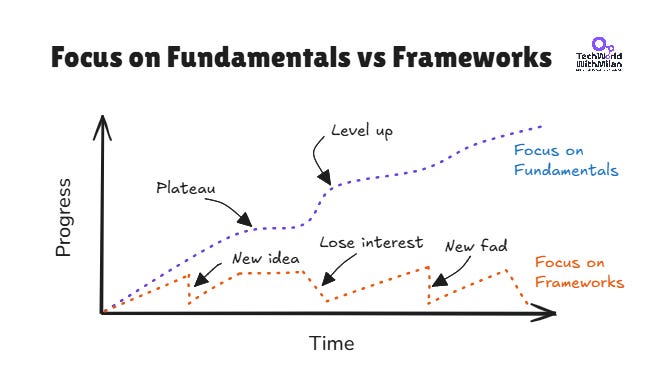 Learn your frameworks, as it’s necessary to ship. But the actual meat should be the fundamentals. That’s all that carries across companies, teams, and over the decades. And they don’t expire.” In an age when AI writes code for you, fundamentals are the only things that make you adaptable and resilient.