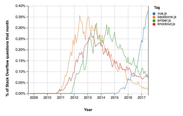 An analysis by Stack Overflow of JavaScript framework traffic clearly shows this trend. The rise, peak, and gradual decline all occur within a couple of years. Around 2011, Backbone, Knockout, and Ember were the ‘it’ frameworks. By 2015, Angular 1.x was no longer supported, and Angular 2.0 required developers to rewrite their applications.