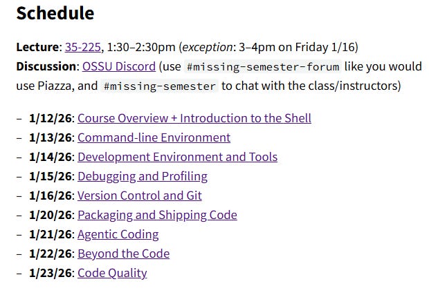 Check this free course at MIT called “The Missing Semester of Your CS Education” that covers topics no one ever tells you about: the shell, Git, debugging, profiling, continuous integration, and setting up a development environment.