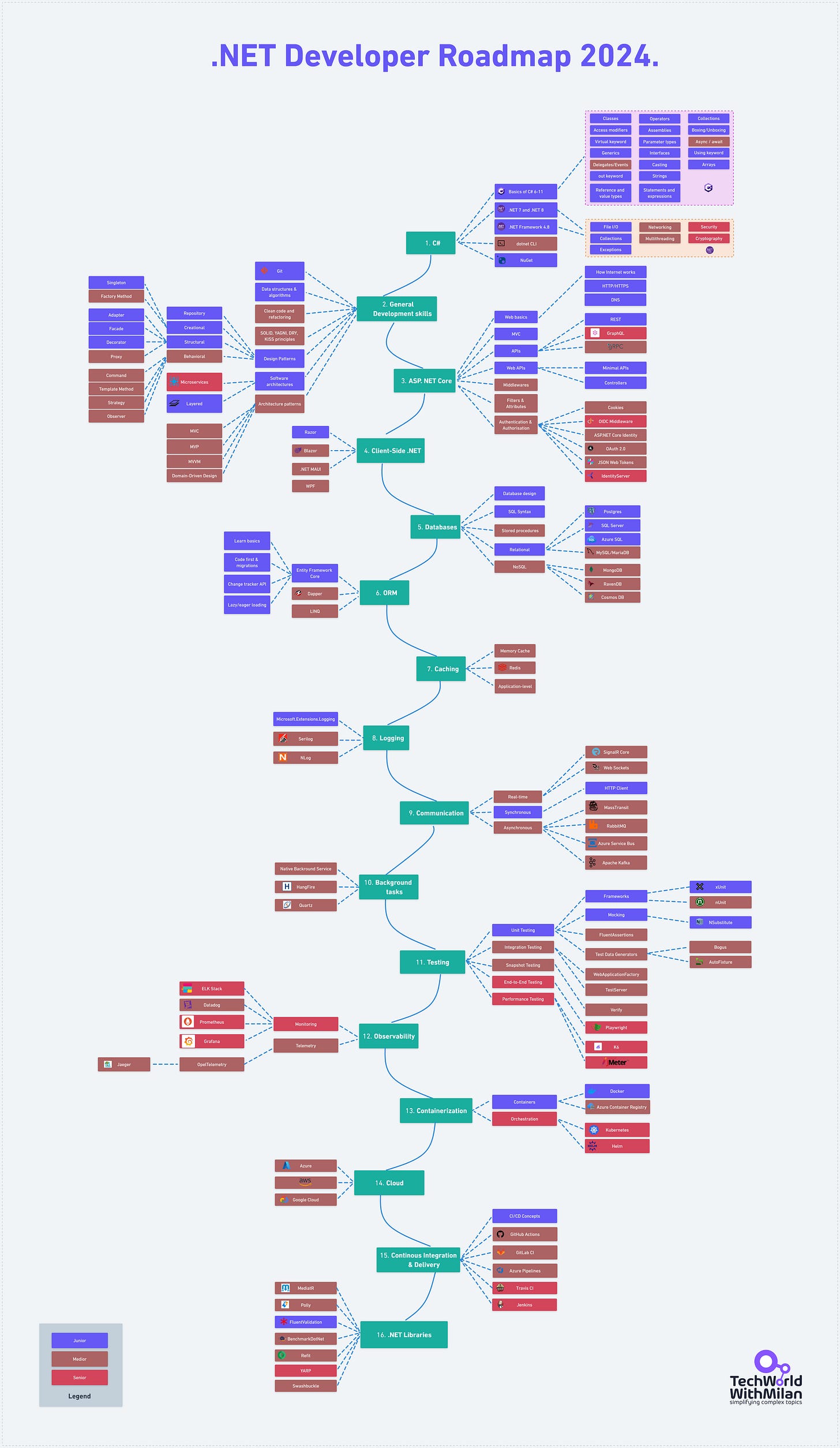 This is a step-by-step guide to becoming a .NET Developer, with links to relevant learning resources and by seniority level.