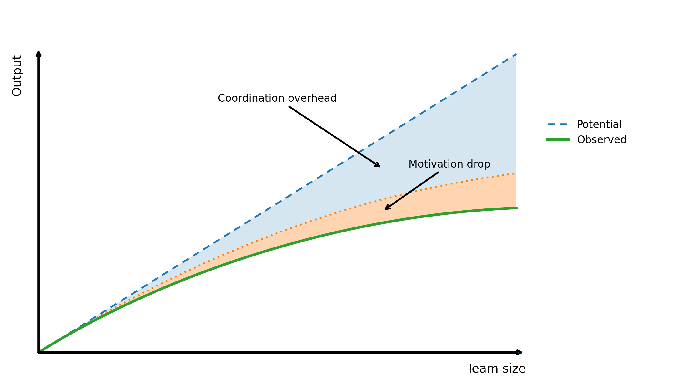 Ringelmann Effect: Individual output drops as team size goes up.