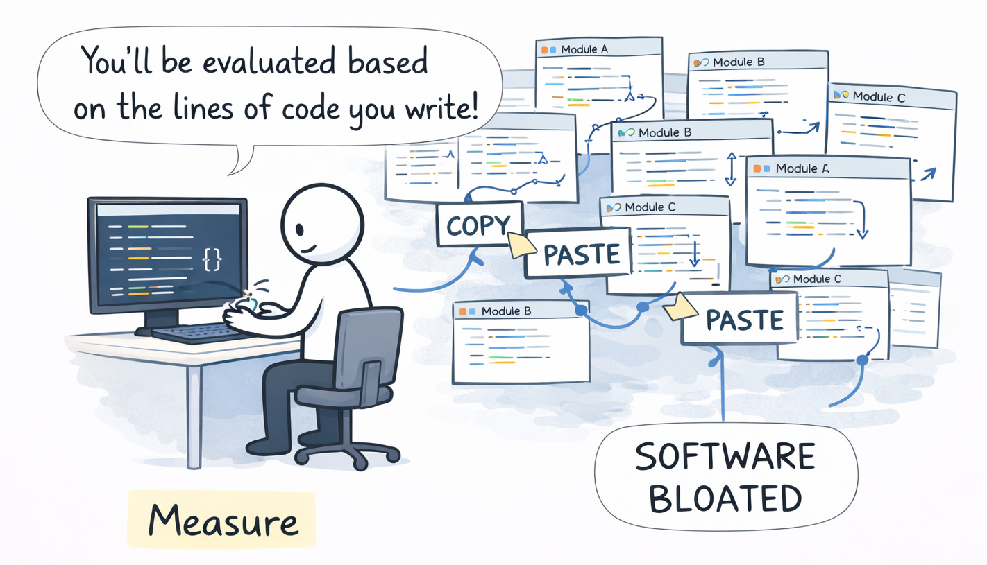 Examples. I watched a team get rewarded for lines of code written at the start of 2000, and the number of PRs created some years later. Developers started copy-pasting instead of extracting shared logic. Some created PRs for almost every commit they made.