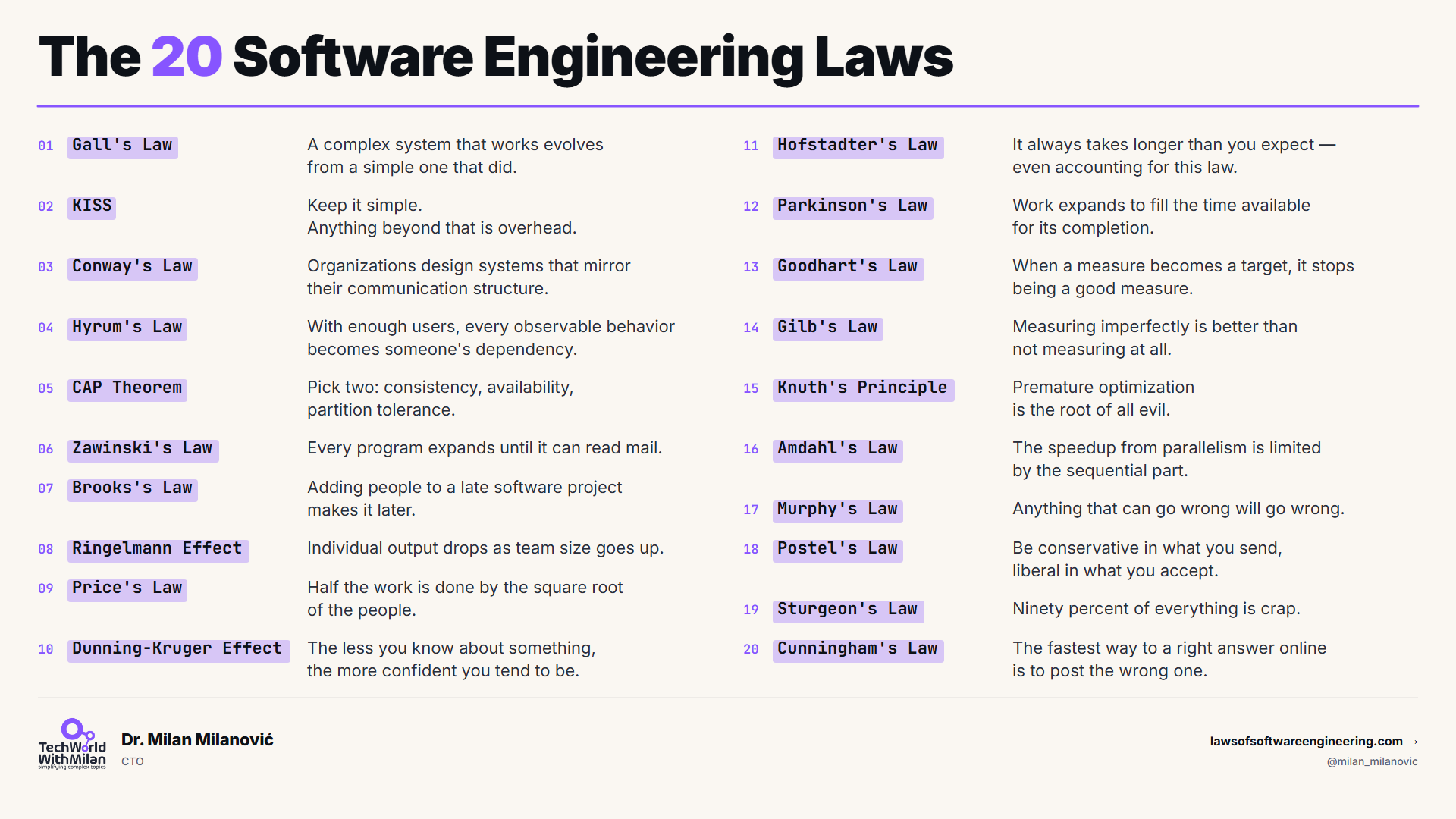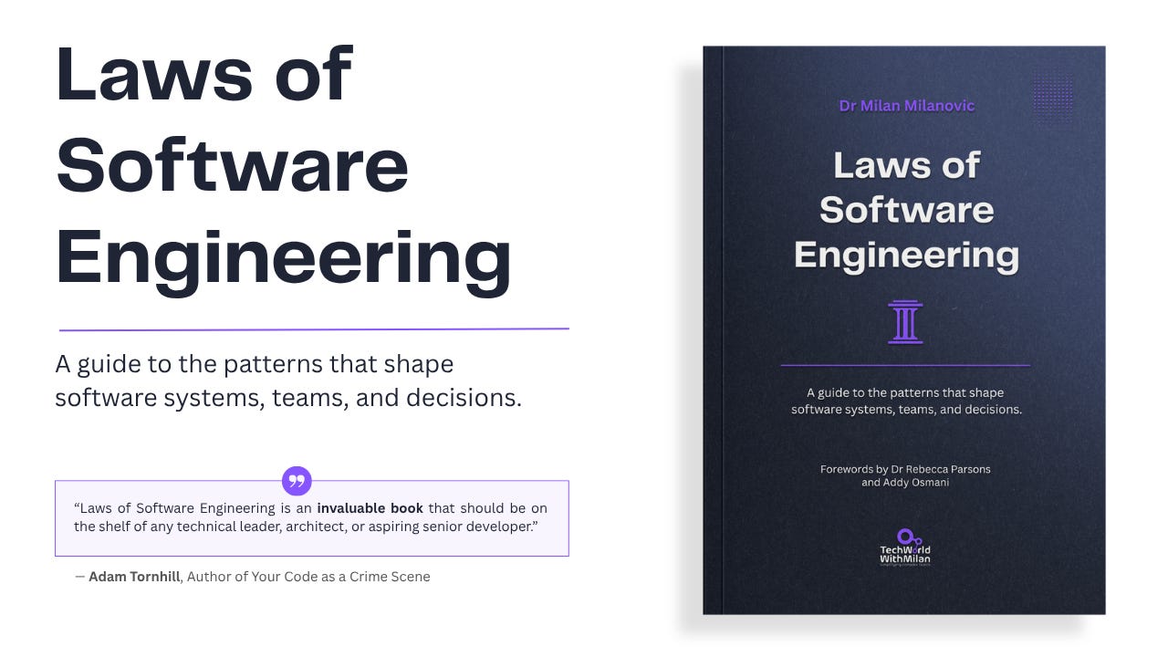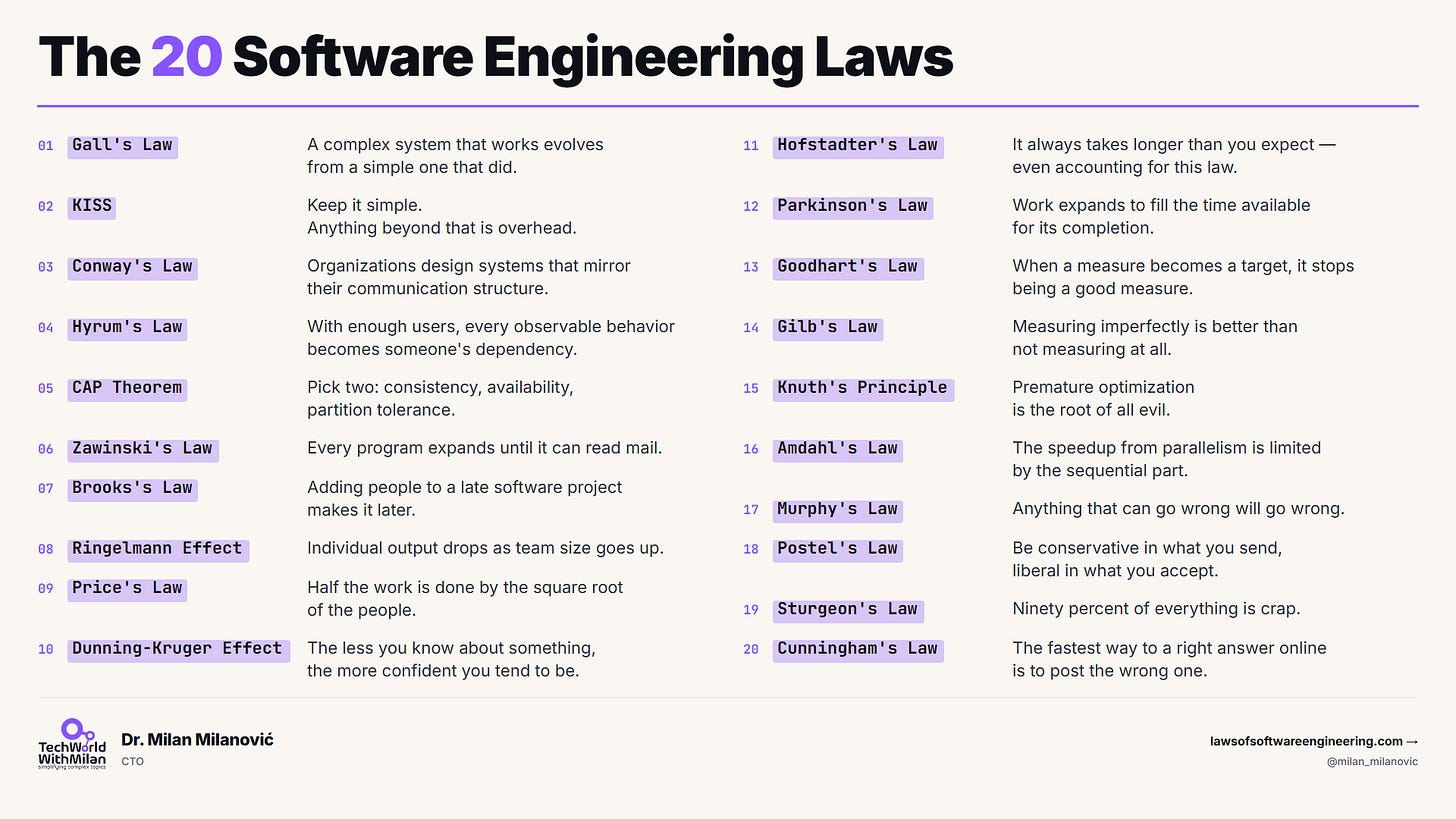 This issue covers 20 software engineering laws. My book covers 56 laws across architecture, people, time, quality, scale, code, and decision-making.
